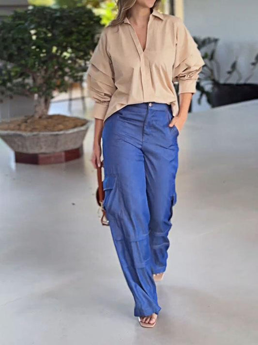 Women's Solid Color Shirt and Denim Pants Two-piece Set Purchased Separately