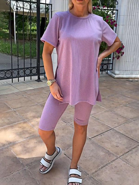Women's Solid Color Stretch Knit Top and Shorts Two-piece Set