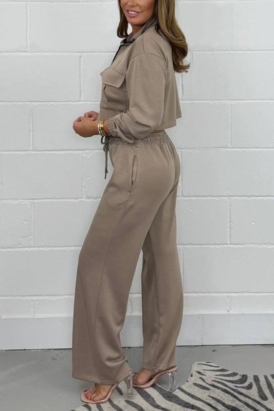 Women's zipper crop top high waist wide leg pants two piece set Loungewear Sets