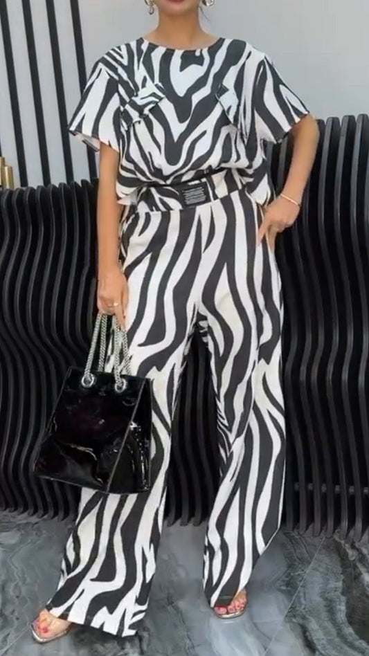 Women's Zebra Print Short Sleeved Crew Neck Suit