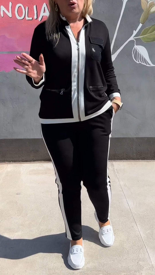 Women's Zipper Long Sleeve Striped Patchwork Casual Suit
