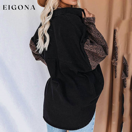 Womens Contrast Leopard Denim Jacket Long Sleeve Button Down Shirts