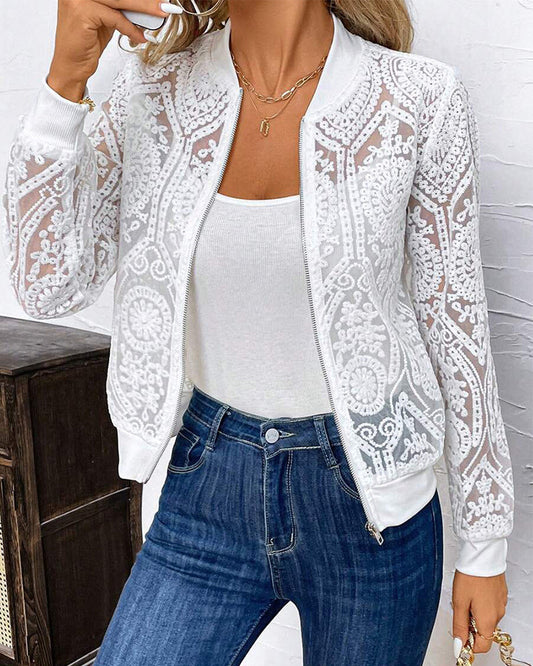 Transparent Lace Zipper Solid Color Coat