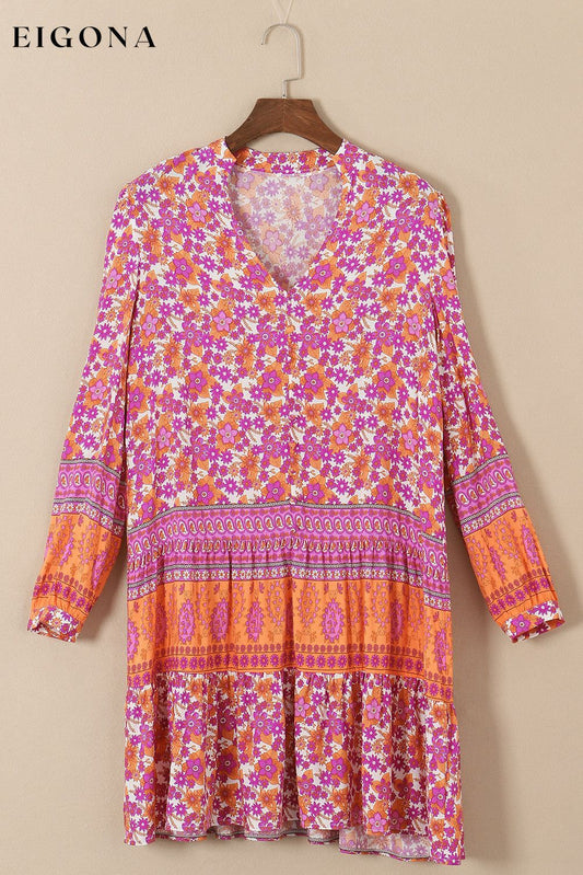 Rose Boho Floral Puff Sleeve V-Neck Ruffled Dress