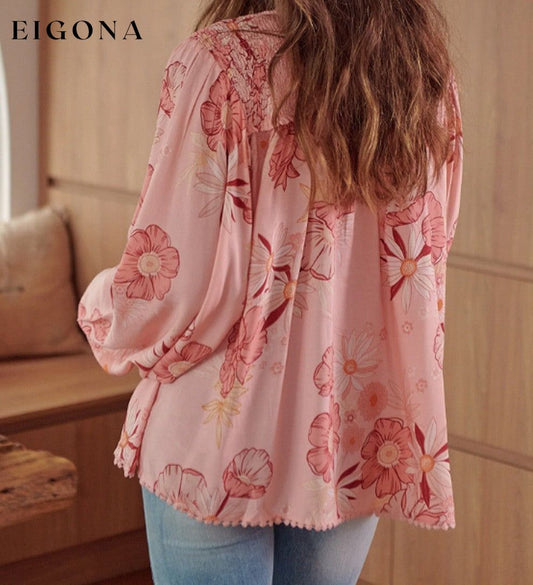 Multicolor Floral Tasseled V Neck Puff Sleeve Blouse