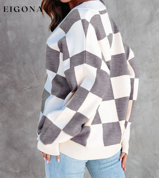 Gray Contrast Checkered Print Button Up Sweater Cardigan