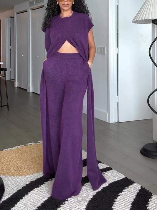 Zweiteiliger Anzug für Damen mit Rundhalsausschnitt, einfarbig und kurzen Ärmeln