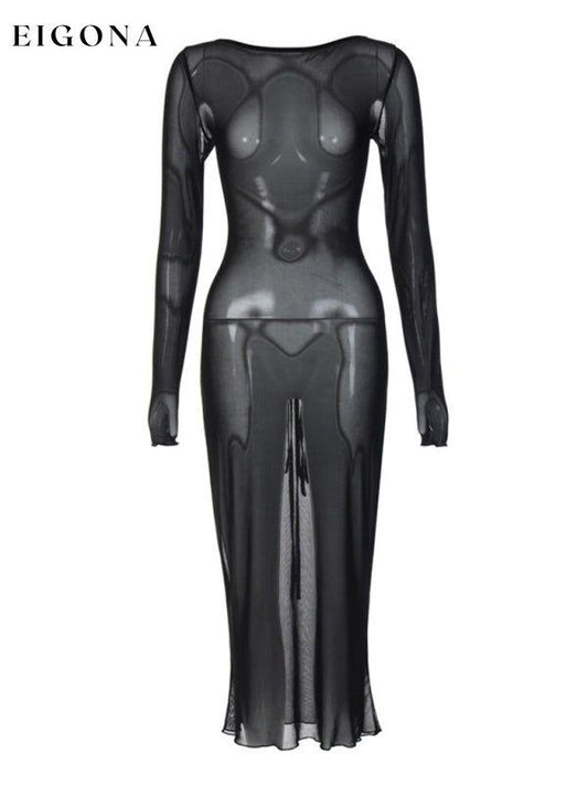 Durchsichtiges, rückenfreies Netzkleid für Damen, Schnürung, sexy Midirock, langärmeliges, schmales schwarzes Kleid