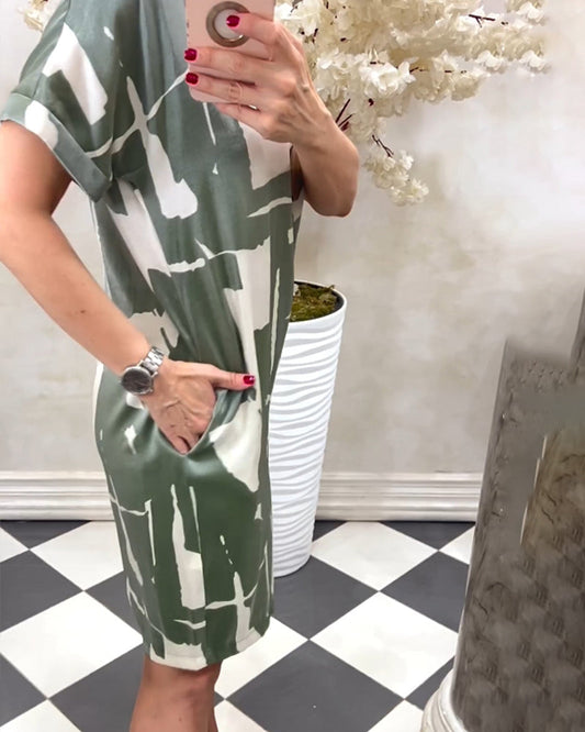 Kleid mit Rundhalsausschnitt und Tasche, kurzärmliges Kleid