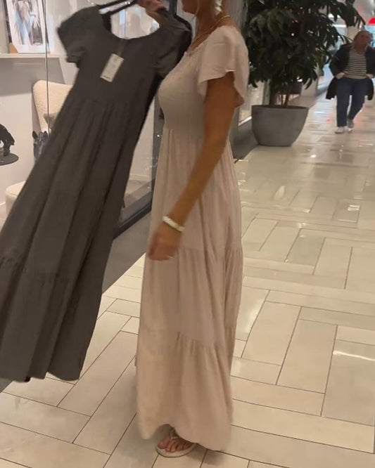 Einfarbiges Plisseekleid mit eckigem Ausschnitt, Rüschenärmeln