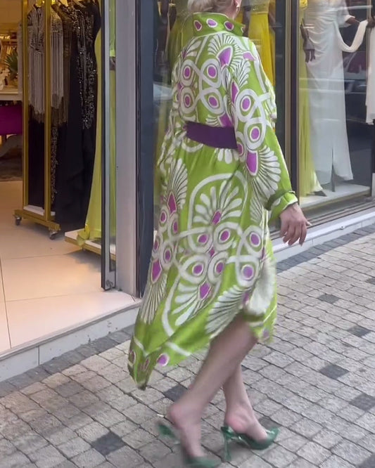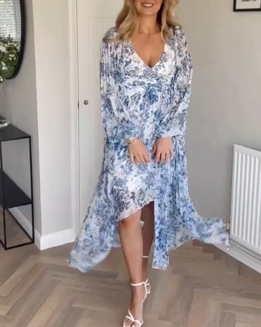 Lässiges, lockeres, bedrucktes Langarmkleid mit V-Ausschnitt