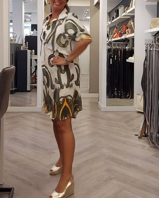Lockeres Kleid mit Revers und halblangen Ärmeln im Retro-Print