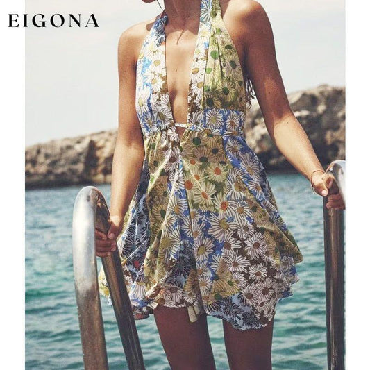 Neues modisches, sexy bedrucktes Neckholder-Kurzkleid mit V-Ausschnitt und Strapsen