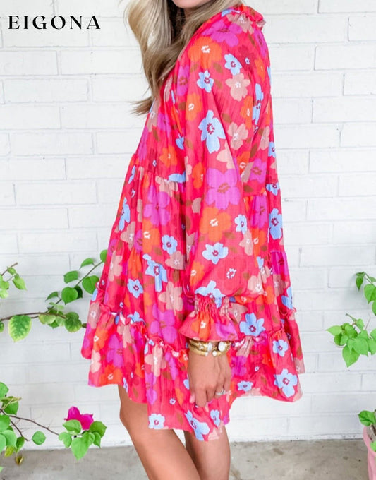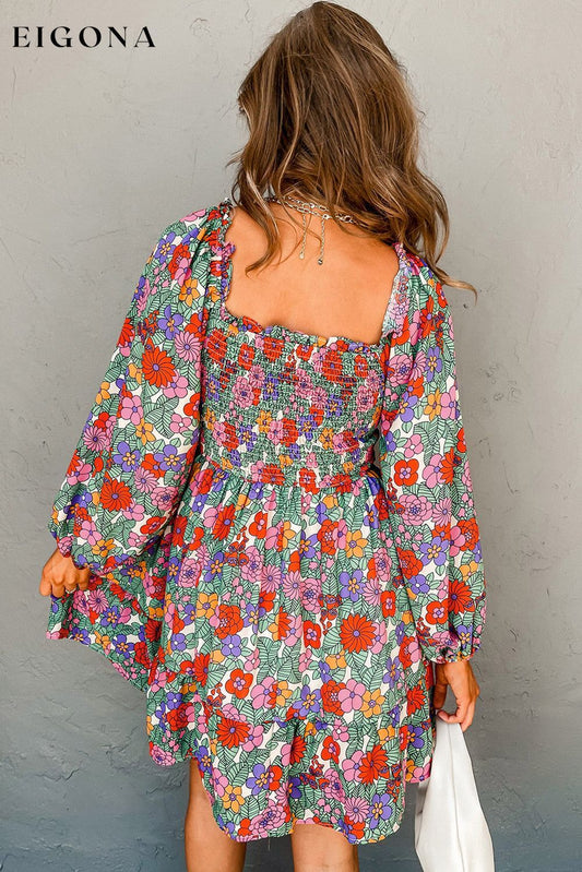 Mehrfarbiges, gestuftes Babydoll-Kleid mit Blasenärmeln und Blumenmuster