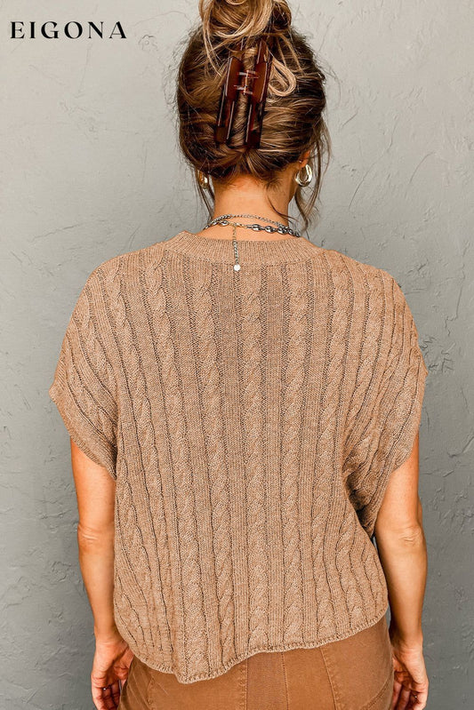 Leichter französischer Beige-Rundhalspullover mit Zopfmuster und kurzen Ärmeln