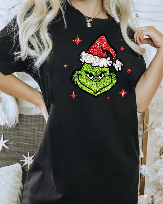 T-Shirt Weihnachten mit Grinchgesicht und künstlichem Glitzer