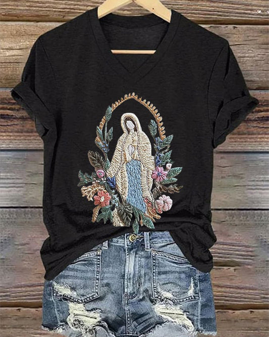 Christliches T-Shirt mit V-Ausschnitt und Blumendruck „Unsere Liebe Frau“ für Damen