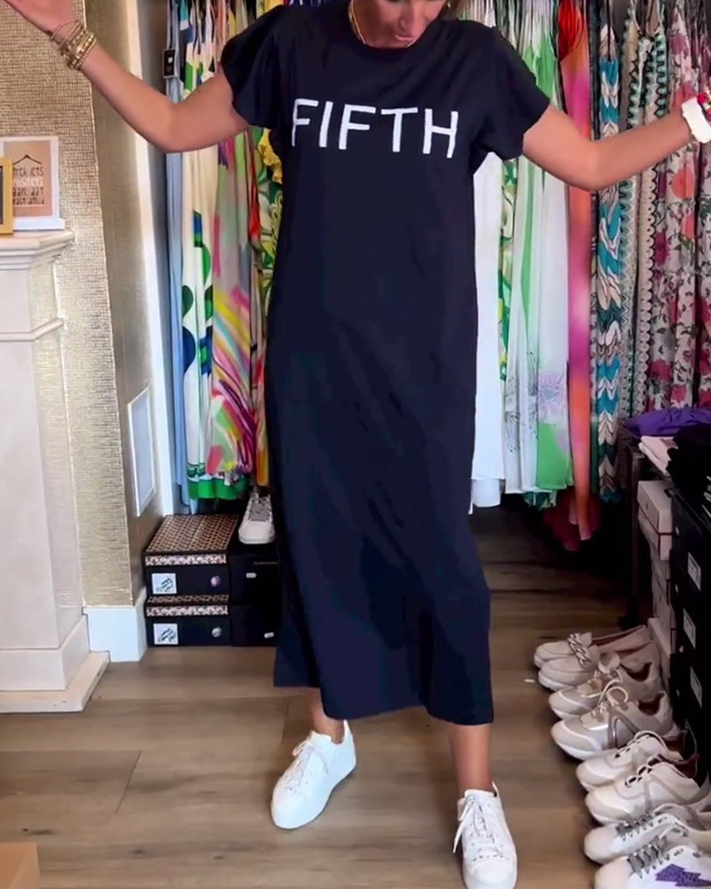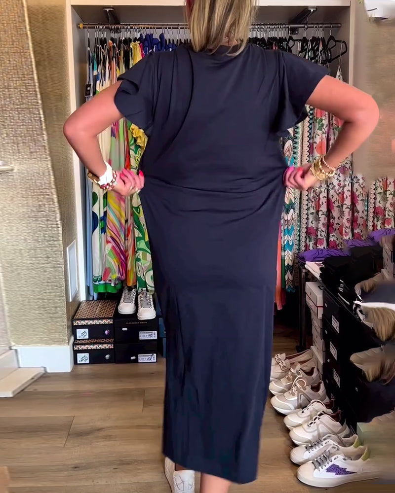 Lässiges Kleid mit Buchstabendruck, Rüschenärmeln und Schlitz