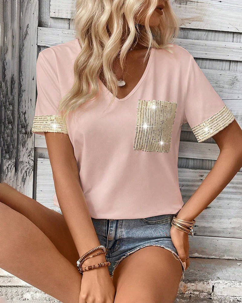 Lässiges Kurzarm-T-Shirt mit V-Ausschnitt und Pailletten