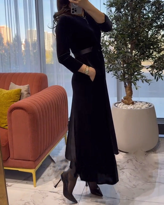 Elegantes, langes, schwingendes Kleid in einfarbiger Samtnaht