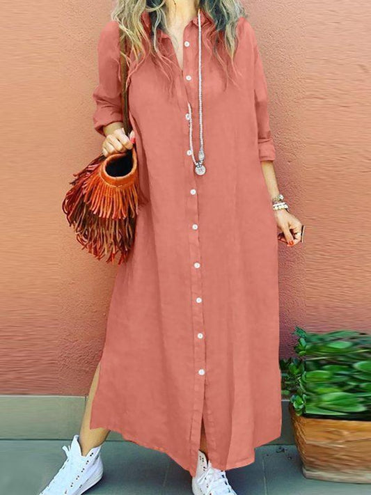 Women's Lapel Long-sleeved Cardigan Cotton and linen Dress