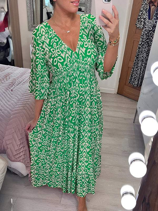Vestido casual de manga tres cuartos estampado con cuello en V