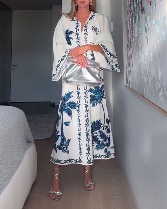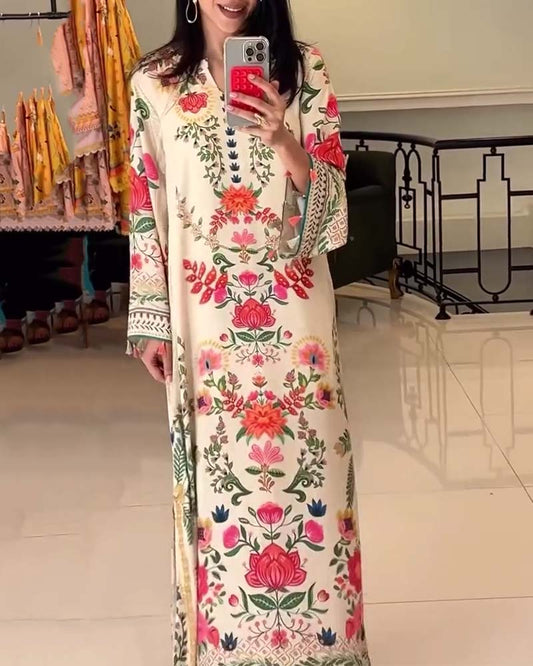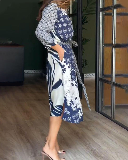 V-Neck Long-Sleeved Elegant Printed Dress
