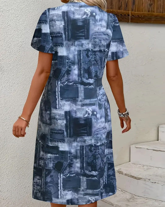 Casual Faux Denim Printed Crew Neck Dress