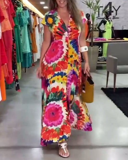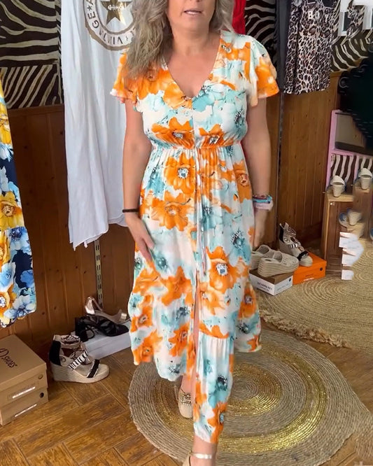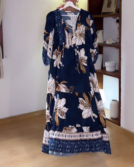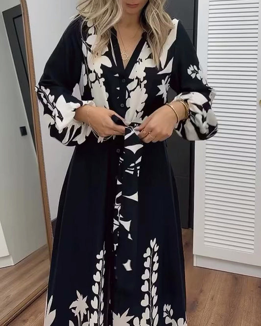Vestido elegante con cintura y manga larga en V profundo con estampado floral