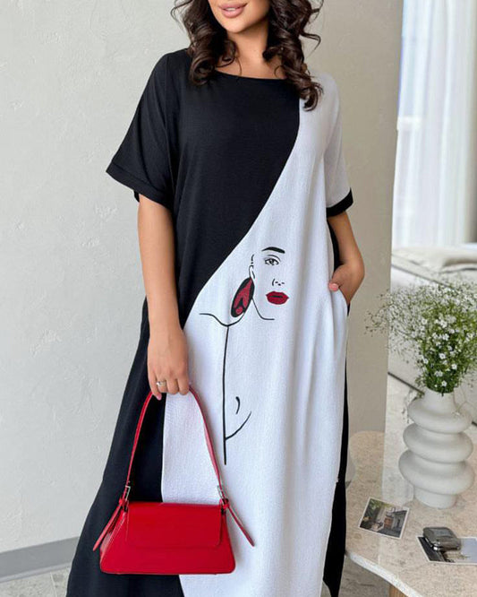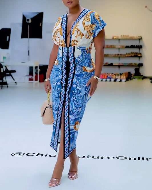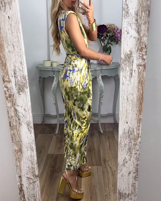 Vestido delgado sin mangas con abertura en V profunda y estampado de moda