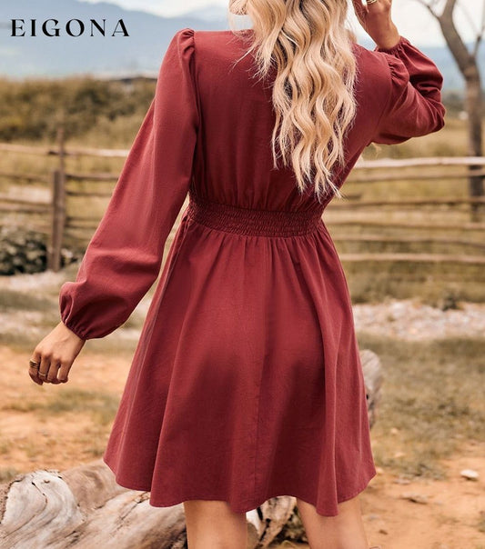 Minivestido con cuello en V y manga larga con cintura fruncida