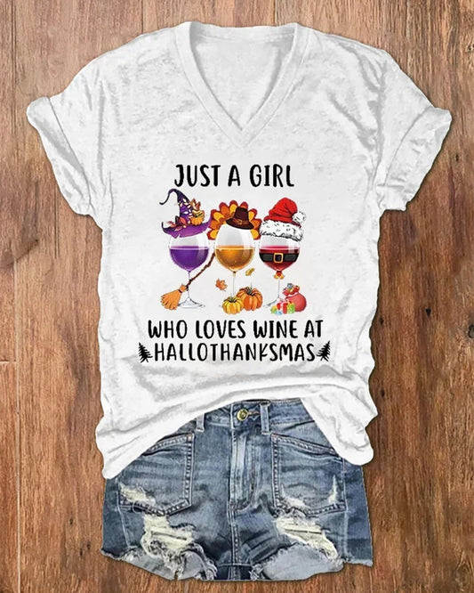 Women's Just A Girl Who Loves Wine At Hallothanksmas Print V-Neck T-Shirt