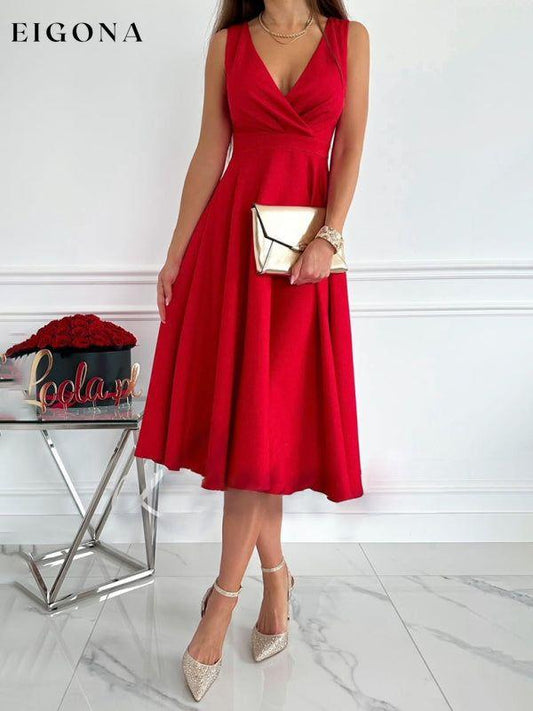 Robe trapèze froncée élégante à col en V de couleur unie pour femmes