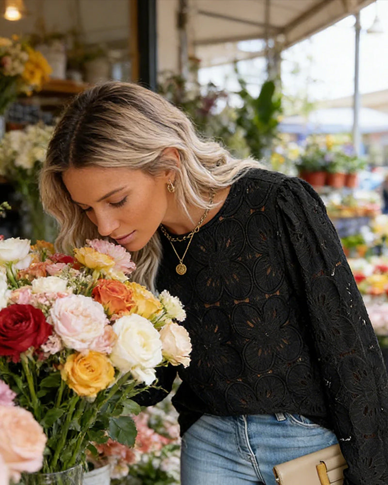 Elegant Hollow-Out Design – Features an intricate eyelet pattern that adds a touch of sophistication and visual texture. This delicate detailing elevates the top, making it a beautiful and alluring piece for various occasions.