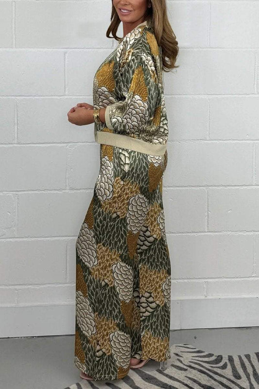 Cardigan e pantaloni in raso con stampa a foglie da donna coordinati