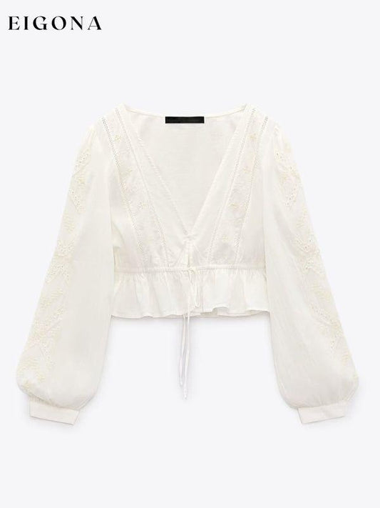 Camicia in cotone da donna nuova camicia dolce retrò con scollo a V drappeggio ricamato top corto a maniche lunghe