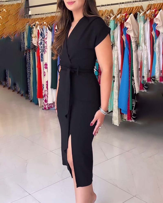 Elegante abito tinta unita con scollo a V e cintura con spacco