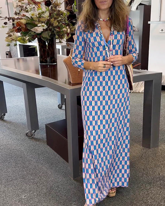 Abito elegante con stampa geometrica a contrasto e risvolto