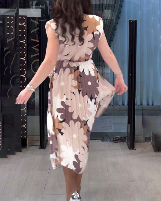 Elegante abito senza maniche plissettato con scollo a V e stampa floreale