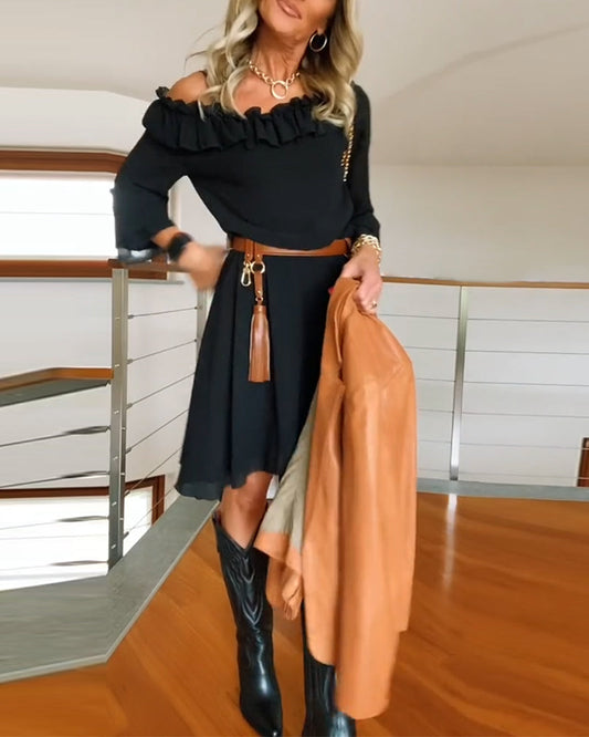 Abito monospalla con maniche a campana, tinta unita, alla moda