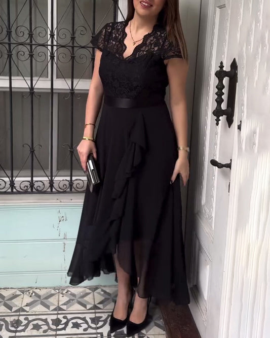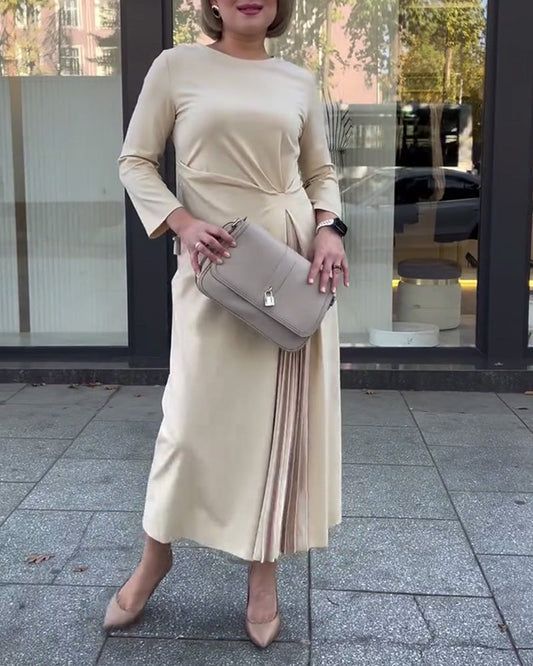Elegante abito patchwork plissettato con scollo rotondo in tinta unita