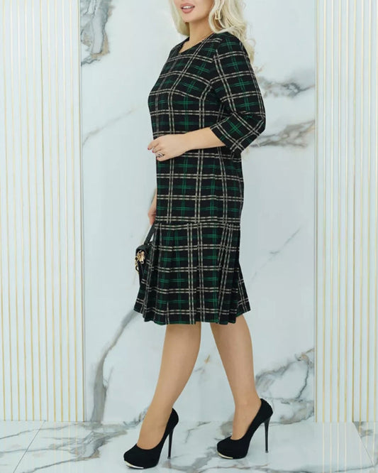 Abito elegante con bottoni e stampa scozzese a scollo tondo