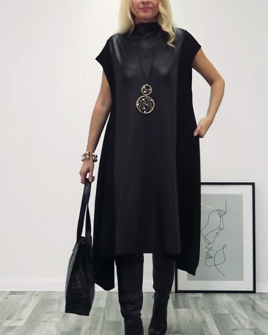 Abito alla moda con tasca a maniche corte e collo alto in tinta unita