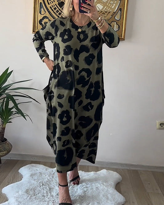Abito casual con stampa leopardata, monospalla, manica lunga e ampio