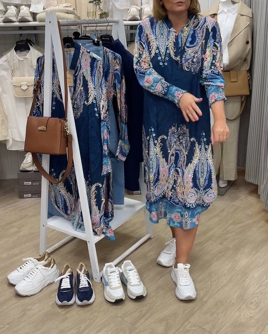 Abito con maniche a lanterna e stampa vintage con bottoni