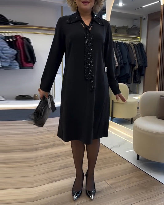 Elegante abito a trapezio con maniche a lanterna e paillettes