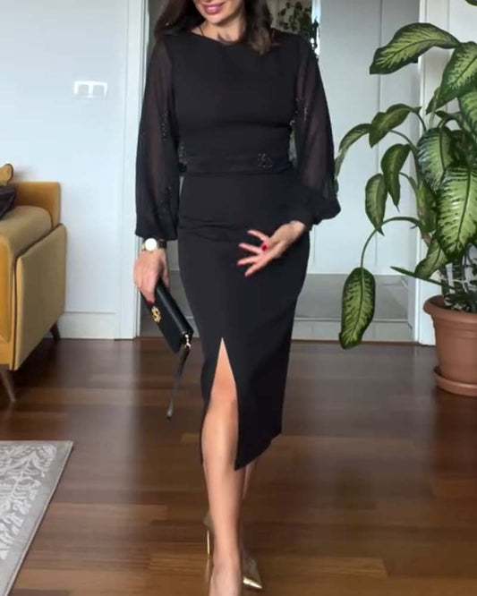 Abito con spacchi sui fianchi e perline con maniche a sbuffo