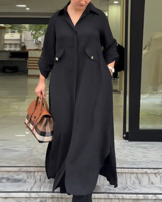 Abito camicia con risvolto in tinta unita e finte tasche