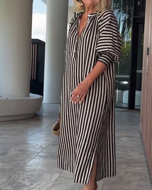 Abito a righe con spacchi e bottoni e maniche a sbuffo