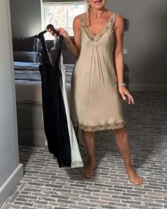 Abito sexy in pizzo patchwork con bretelle e scollo a V